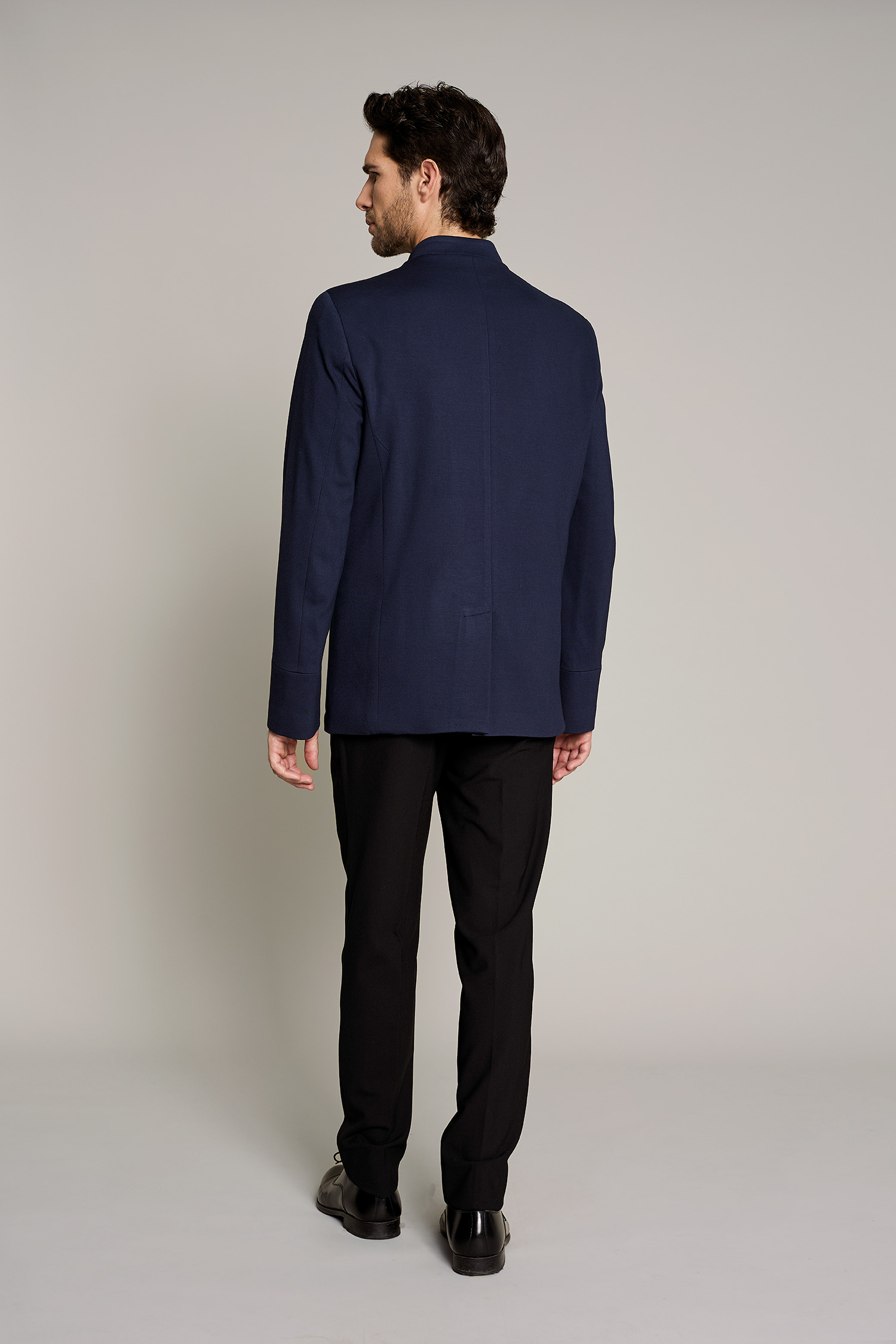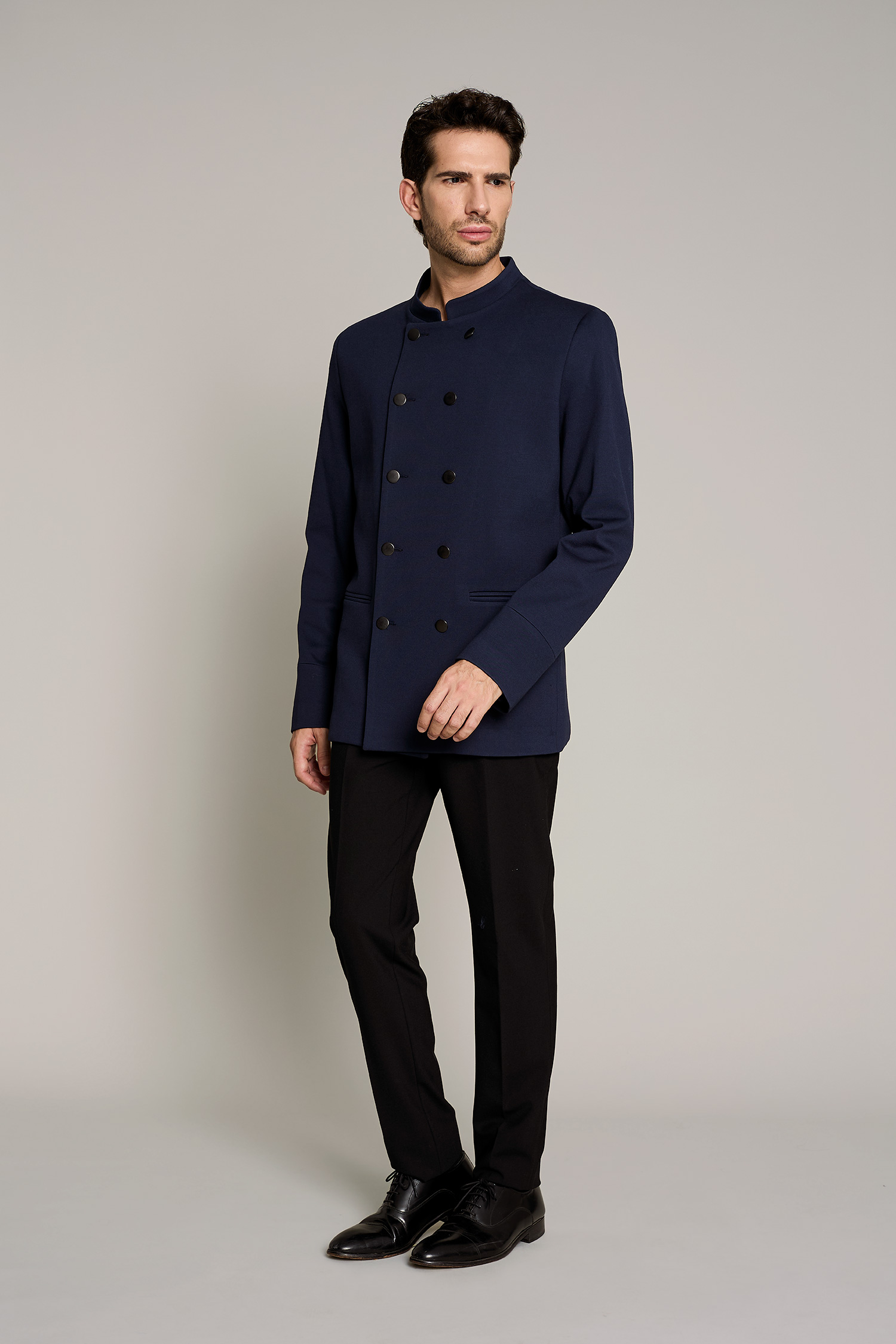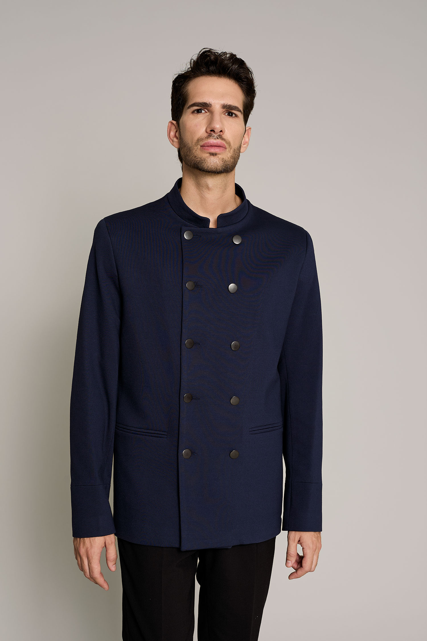 La chaqueta de hombre en color negro, tiene cuello mao y es una prenda diseñada para profesionales que buscan estilo y confort sin comprometer la funcionalidad. Su diseño moderno y tejido técnico permiten una gran libertad de movimiento, adaptándose perfectamente a cualquier entorno de trabajo. Con una composición de 42% lana 54% poliéster 4% elastán, esta prenda garantiza transpirabilidad y resistencia al desgaste