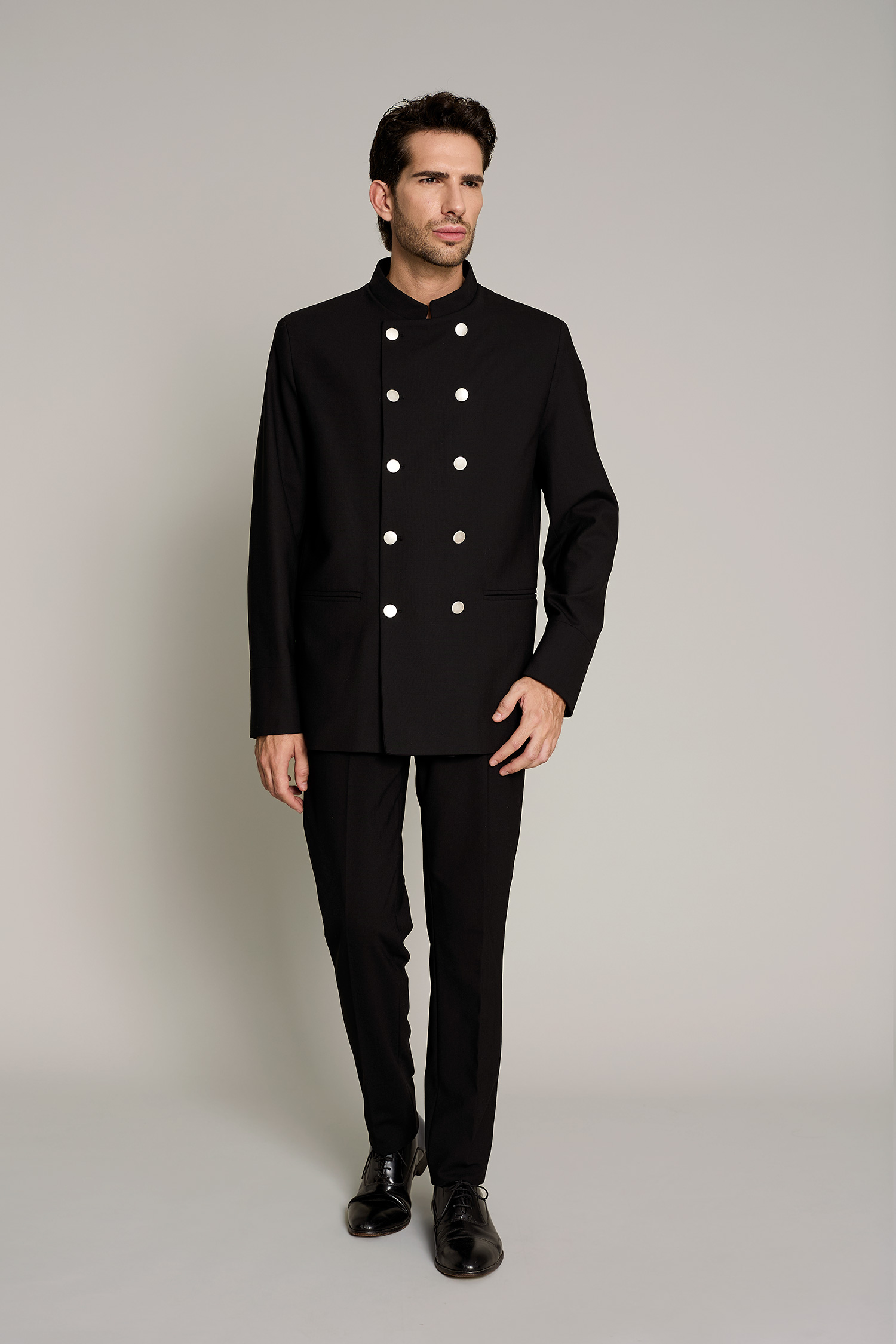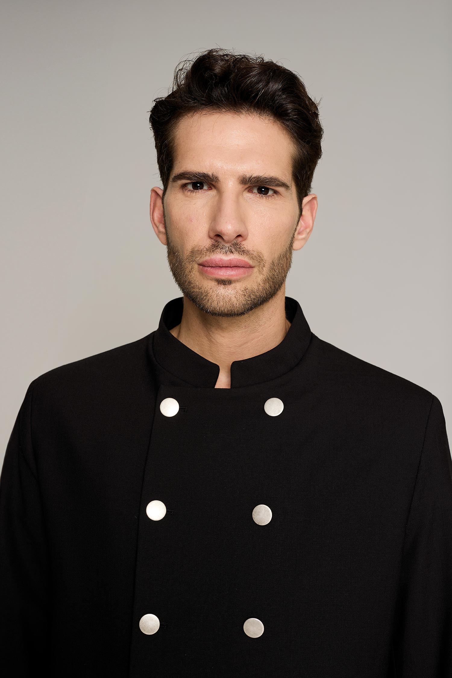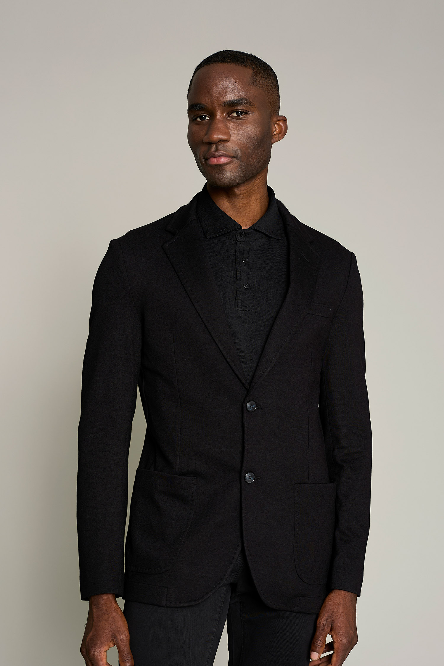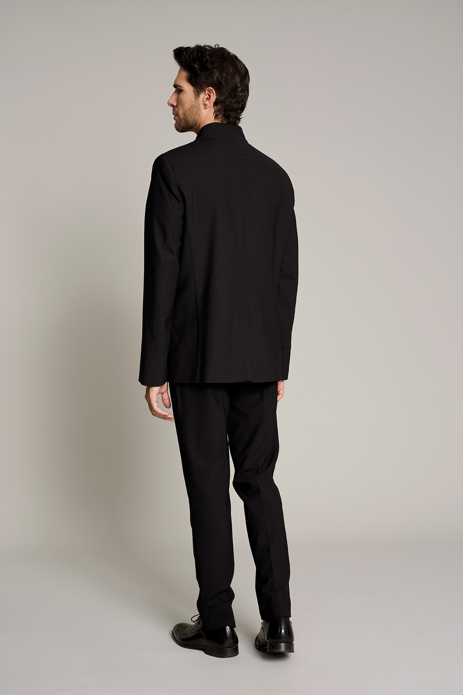 La chaqueta de hombre en color negro, tiene cuello mao y es una prenda diseñada para profesionales que buscan estilo y confort sin comprometer la funcionalidad. Su diseño moderno y tejido técnico permiten una gran libertad de movimiento, adaptándose perfectamente a cualquier entorno de trabajo. Con una composición de 42% lana 54% poliéster 4% elastán, esta prenda garantiza transpirabilidad y resistencia al desgaste