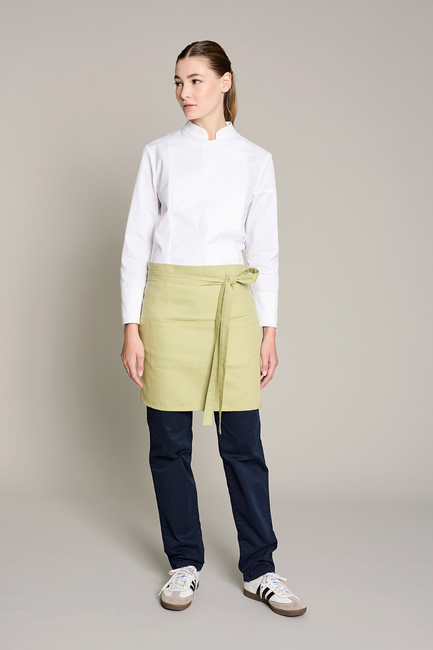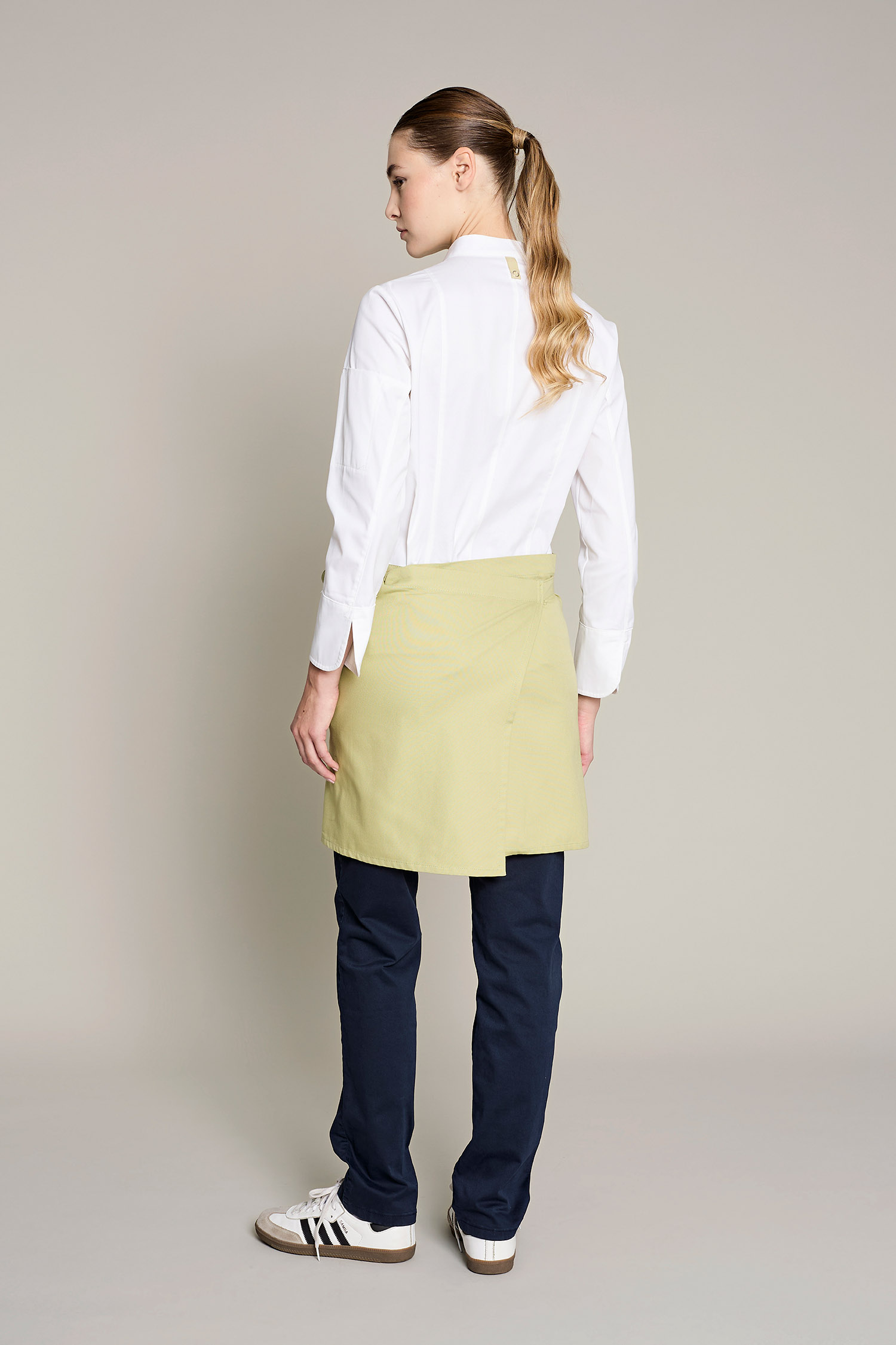 The short unisex apron in tea green stands out for its functionality and sustainability, making it ideal for various work environments. Made from 100% organic cotton fabric, its design includes a practical central double patch pocket, perfect for keeping essential accessories within reach. As part of the Aprons with a Purpose Collection, this apron is manufactured in local social workshops in collaboration with the Roure Foundation, supporting labor inclusion and generating a positive social impact. Additionally, it does not require ironing, which makes for quick and efficient maintenance.