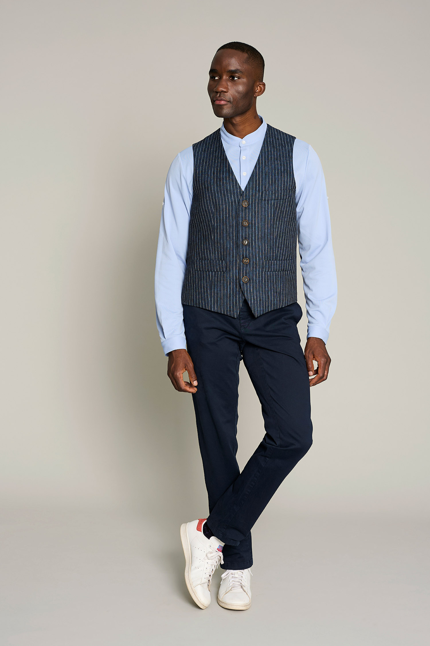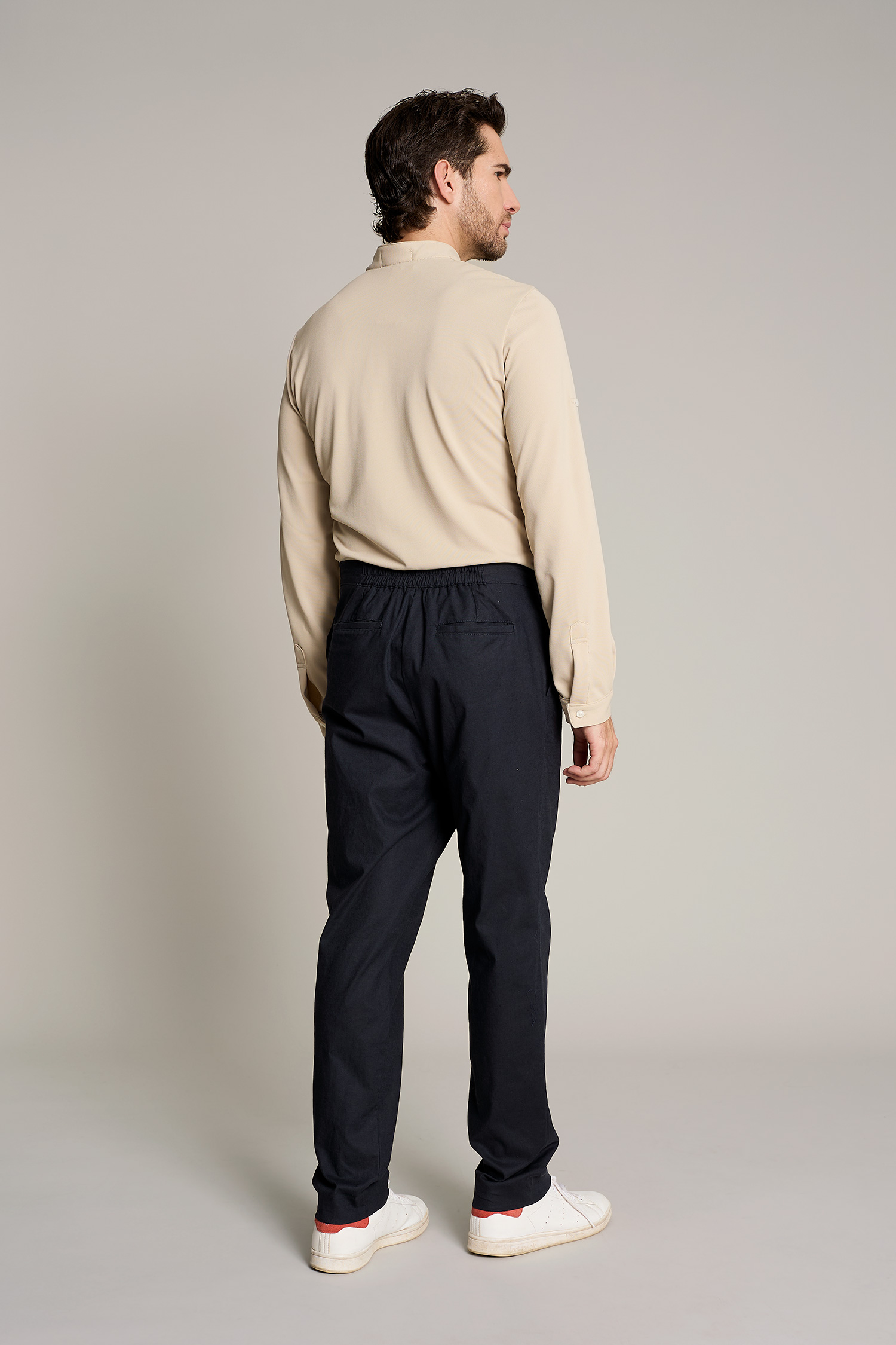 The design includes a Mao collar and three buttons, with lightweight fabric (180 g/m²) that ensures freedom of movement, making the garment sophisticated and comfortable. Easy care and wrinkle-free (no ironing needed).