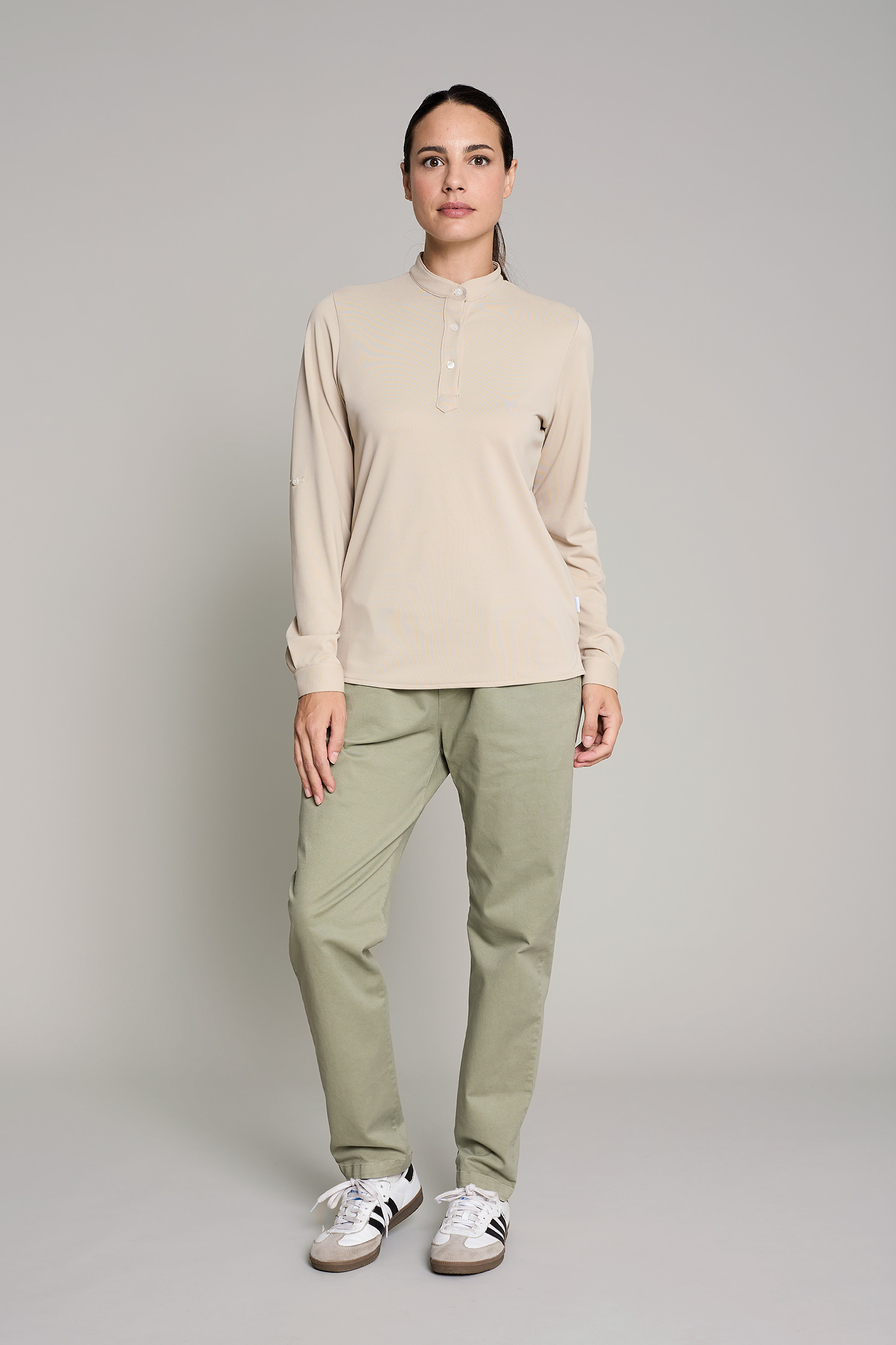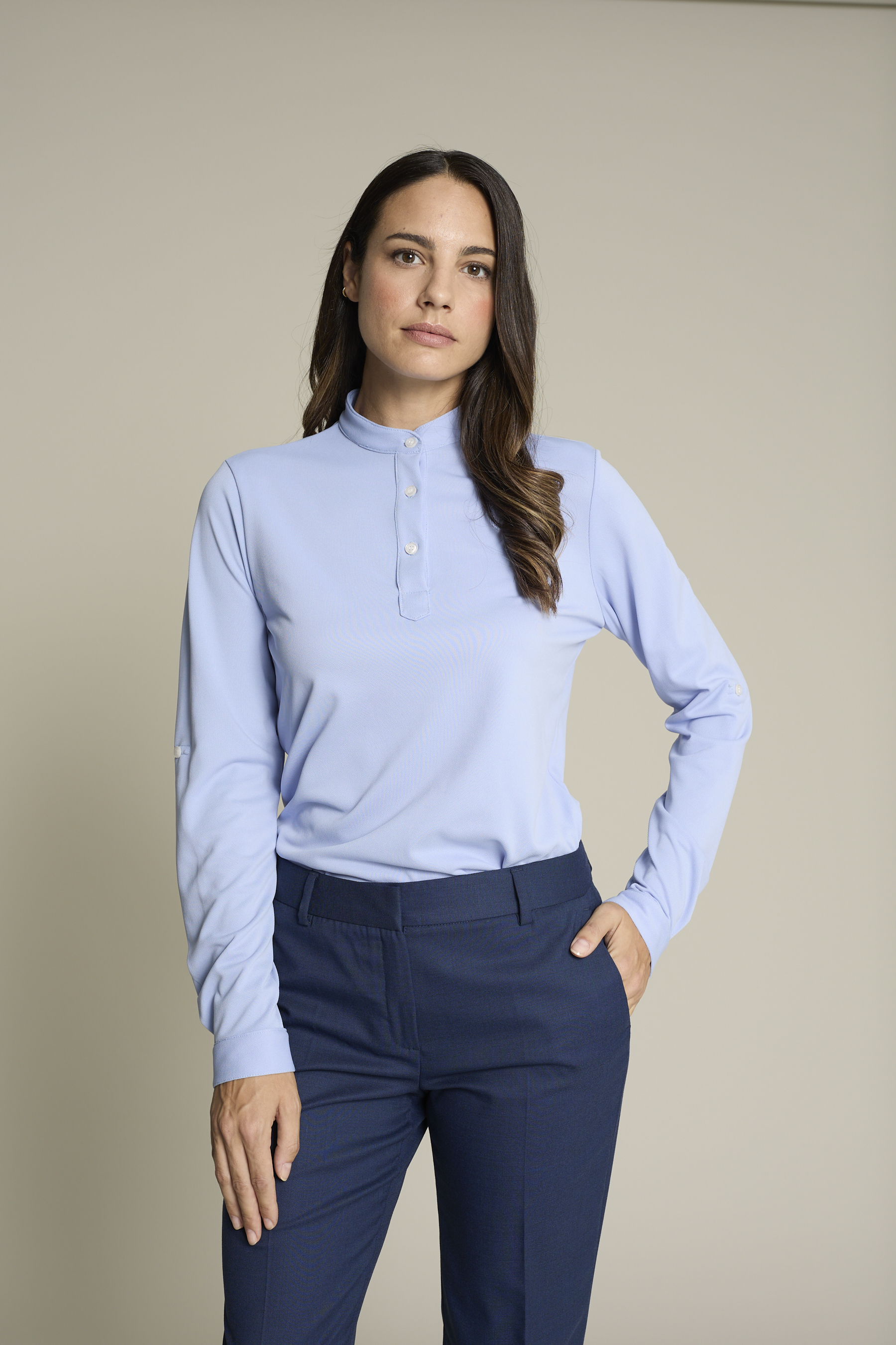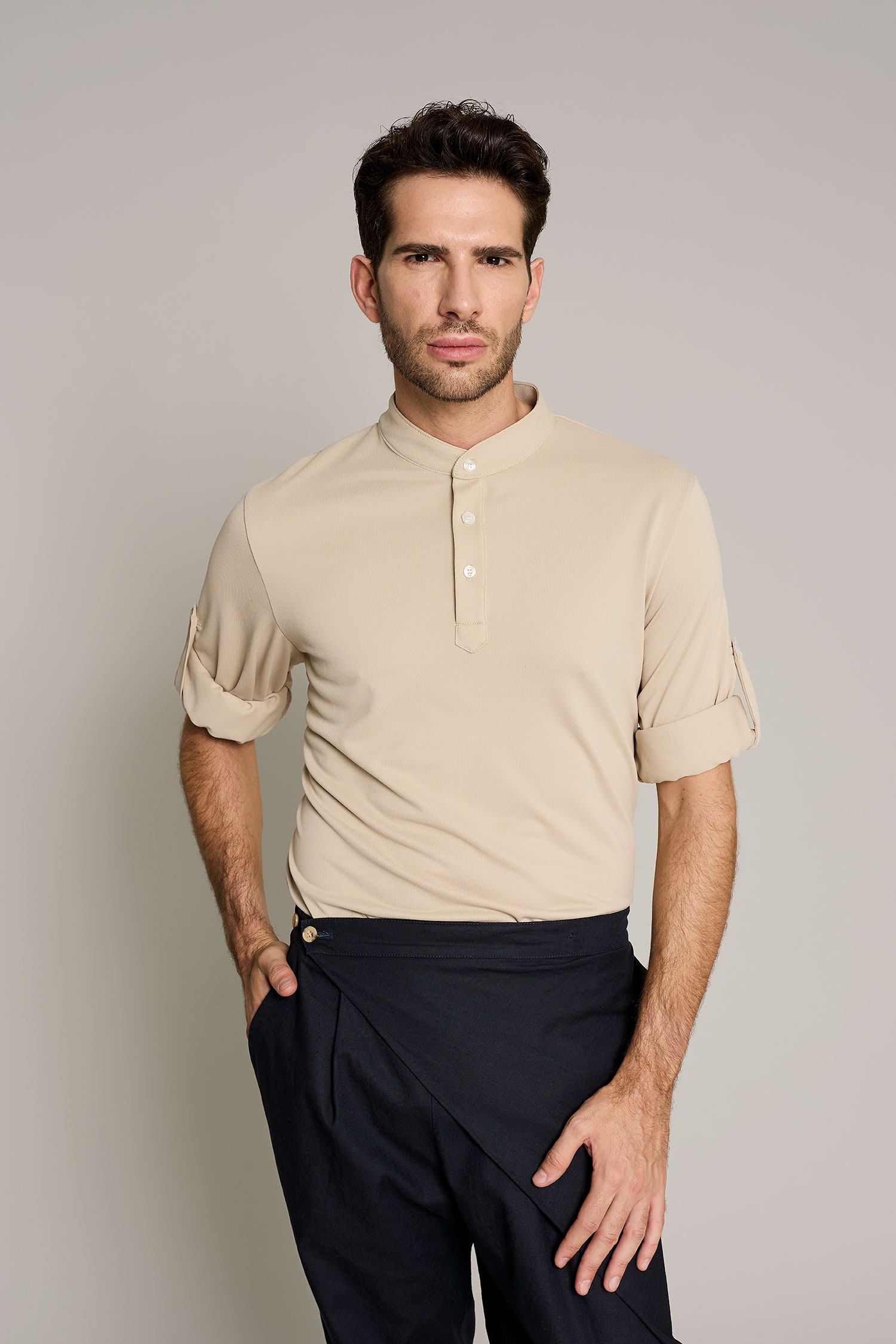 Men's Coolmax long-sleeve polo with tabs to roll up and a cuff with a button. The collar is Mao style with a polo placket and four buttons, finished in a triangle. No ironing required.