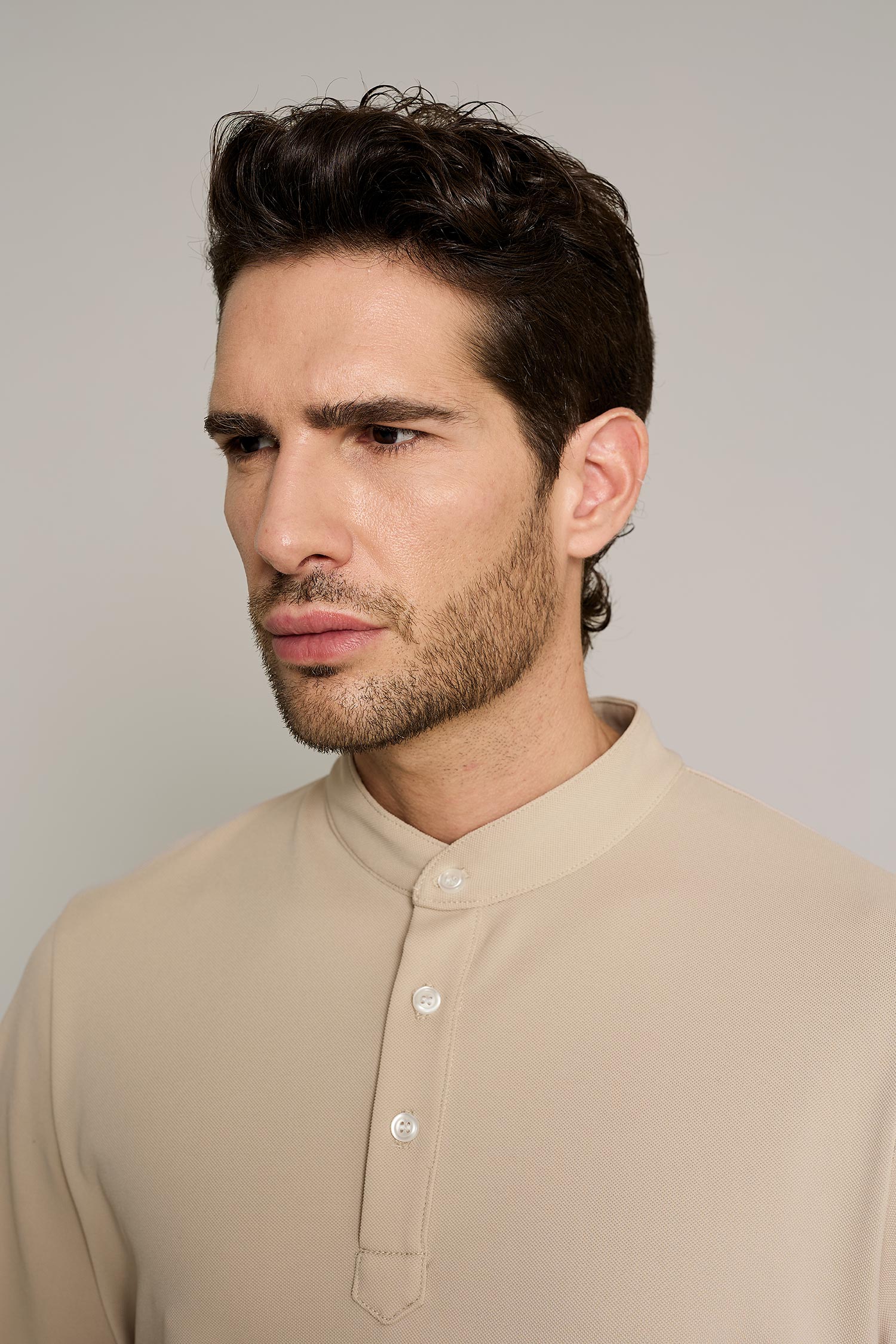 The Milano shirt in beige is designed with recycled Coolmax technical fabric, ideal for those seeking breathability and comfort. No ironing required.
