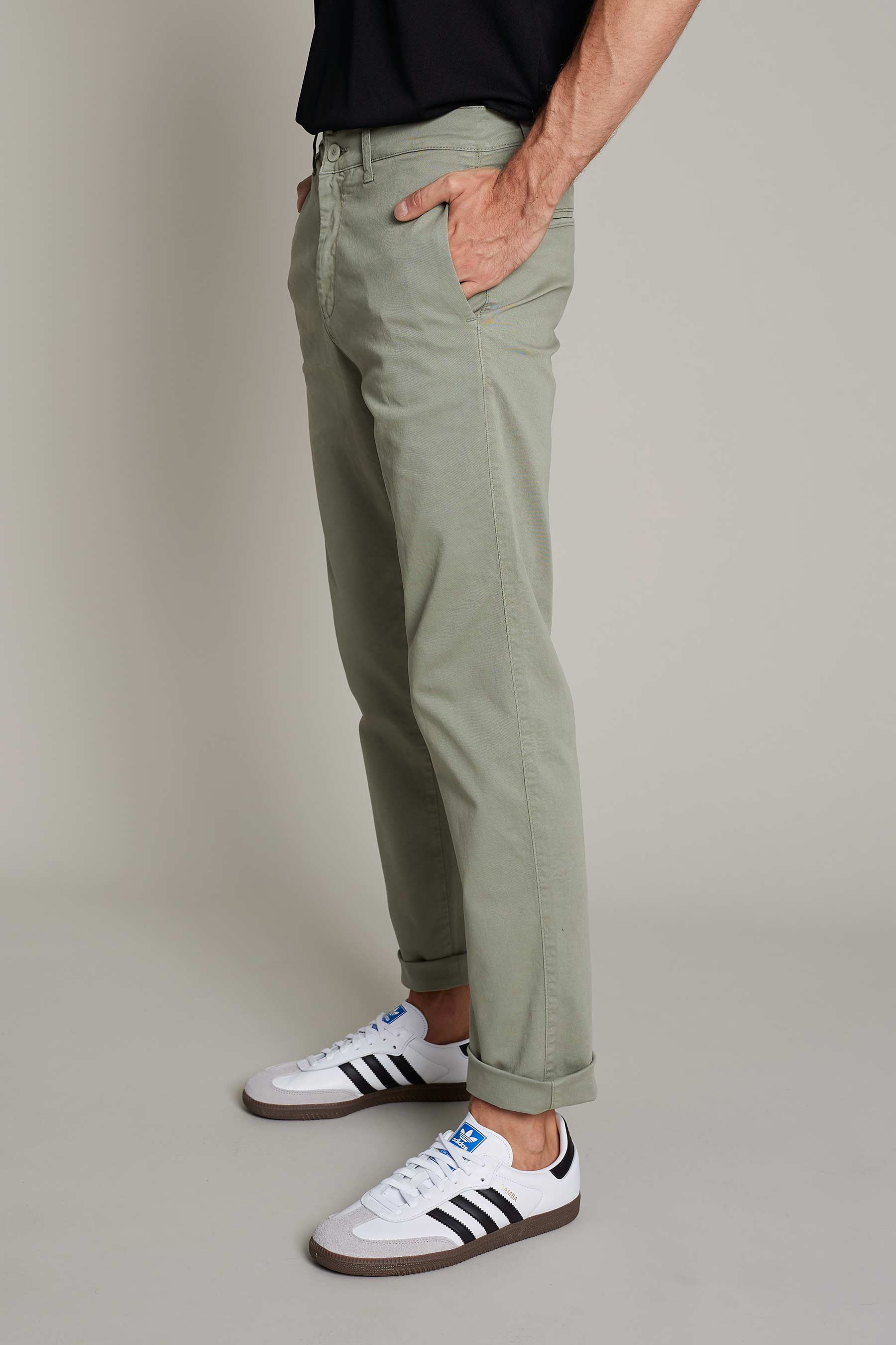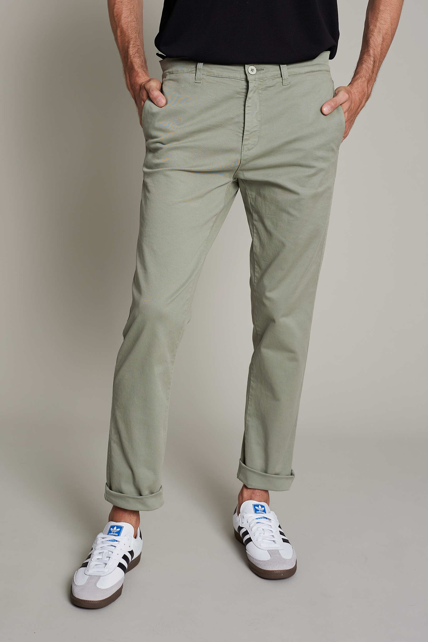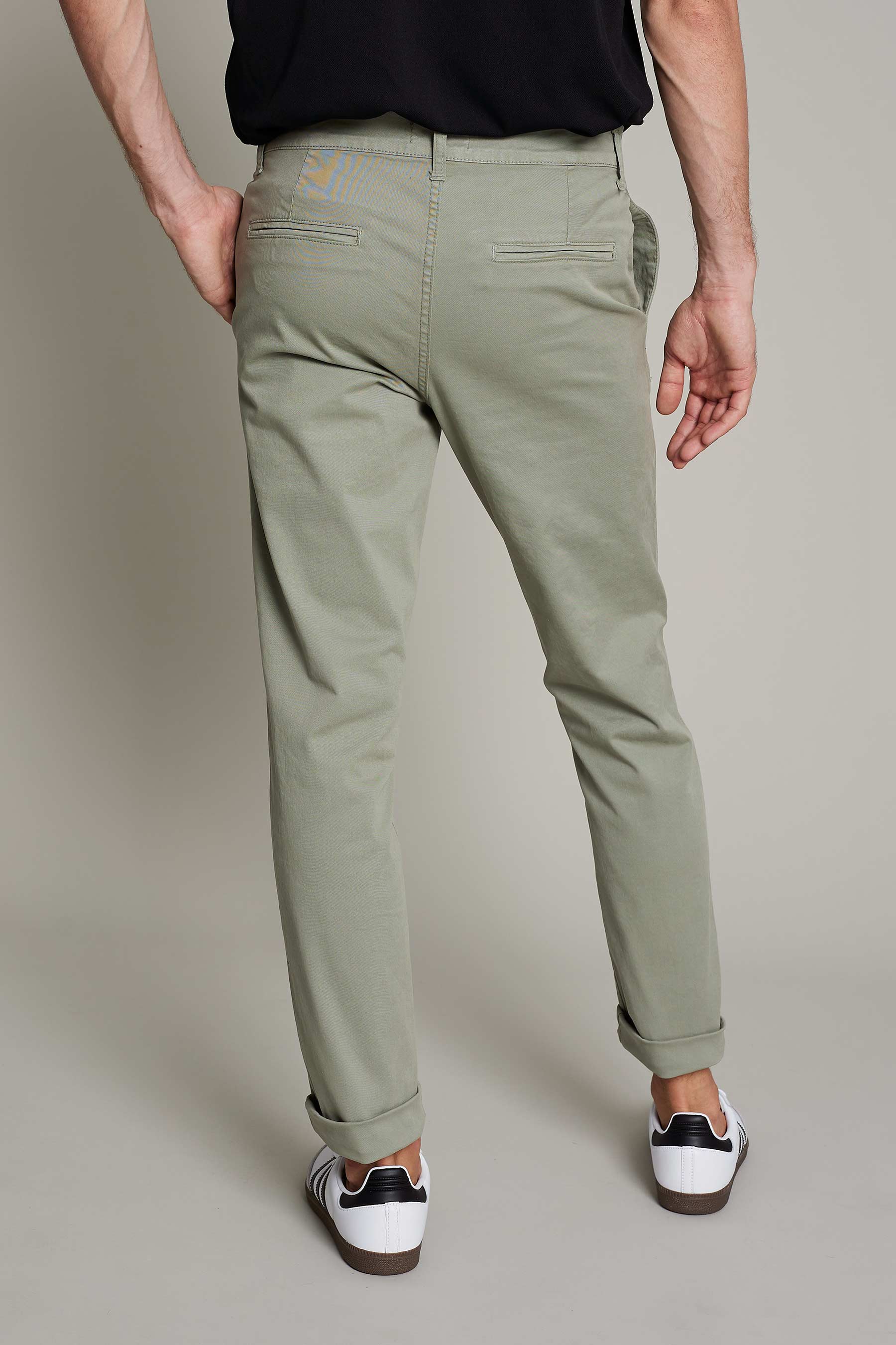 Men's chino pants in washed green cotton for maximum comfort and style for work